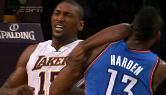 羅恩?阿泰斯特因 “奧本山宮事件” 被禁賽 73 場,成了 NBA 歷史上因單起事件禁賽最長的球員;后來又肘擊哈登致其腦震蕩,差點毀掉后者的MVP生涯,堪稱 “賽場定時炸彈”,沒人知道他何時會爆發。