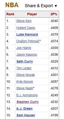 區區斯蒂芬小庫里三分命中率是NBA歷史第7!他哥僅排第13