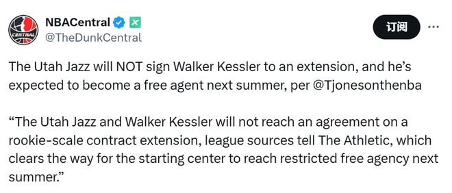 北京時間9月25日,據(jù)聯(lián)盟消息人士向The Athletic透露,猶他爵士隊與中鋒沃克-凱斯勒未能就新秀合同的續(xù)約事宜達成協(xié)議,這意味著他將在明年夏天成為受限制自由球員。