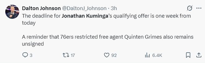 NBA記者Dalton Johnson寫道:距離新賽季資格賽的報(bào)名只剩下一周的時(shí)間,庫(kù)明加、格蘭姆斯都還沒(méi)有跟球隊(duì)達(dá)成續(xù)約。(威少也還沒(méi)有找到下家)