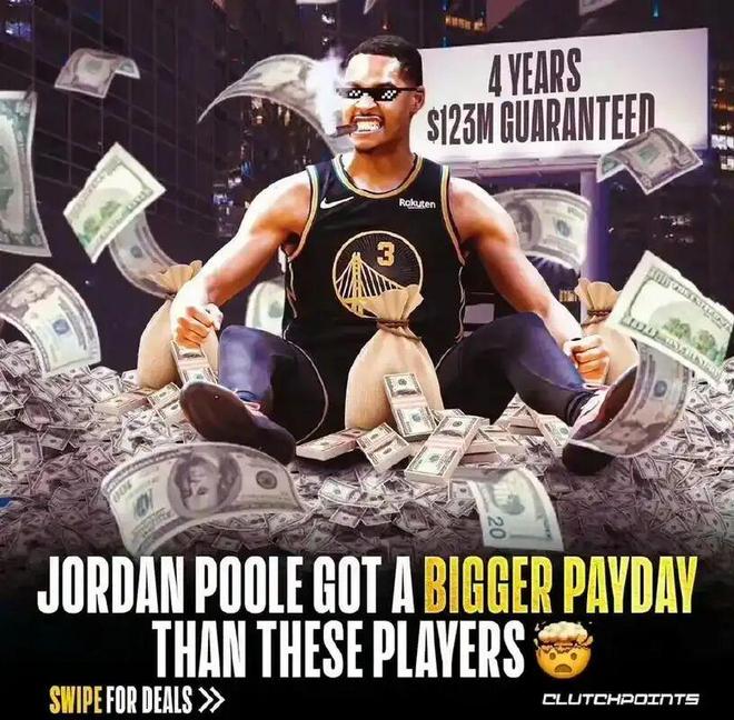 而在之前效力勇士的四個(gè)賽季(19-23),普爾就是身穿3號(hào)球衣,并且在21-22賽季幫助球隊(duì)奪冠,個(gè)人在該賽季常規(guī)賽場(chǎng)均18.5分3.4板4助,季后賽則是場(chǎng)均17分2.8板3.8助,實(shí)打?qū)嵶龀隽酥匾暙I(xiàn)。