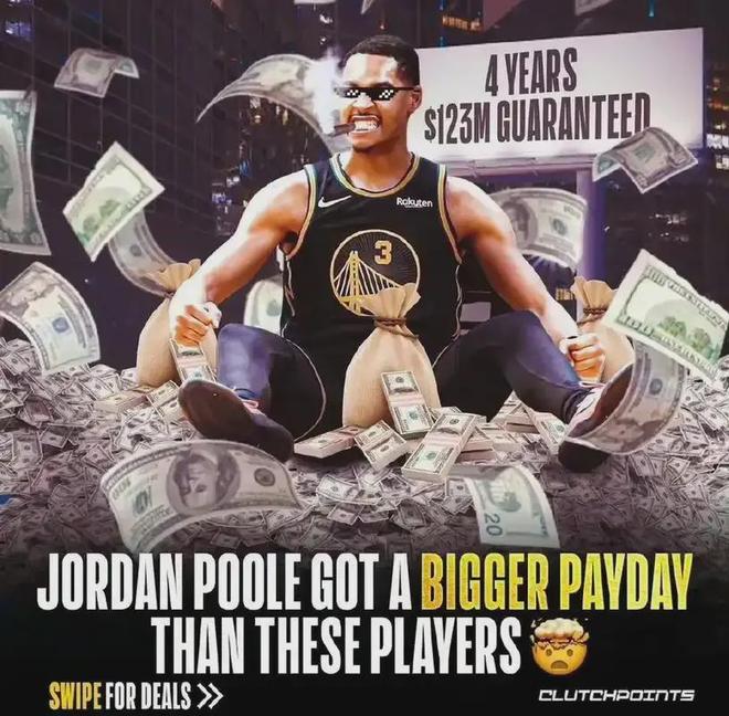 而在之前效力勇士的四個賽季(19-23),普爾就是身穿3號球衣,并且在21-22賽季幫助球隊奪冠,個人在該賽季常規賽場均18.5分3.4板4助,季后賽則是場均17分2.8板3.8助,實打實做出了重要貢獻。