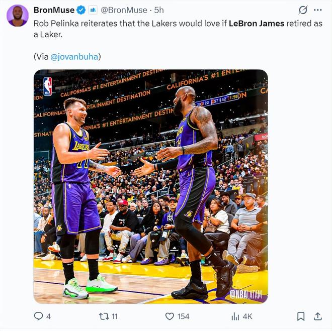 一小時(shí)后佩林卡又在采訪中透露:洛杉磯湖人隊(duì)很希望看到詹姆斯在LAL退役。(這兩個(gè)消息一同出來(lái)后感覺十分的割裂)