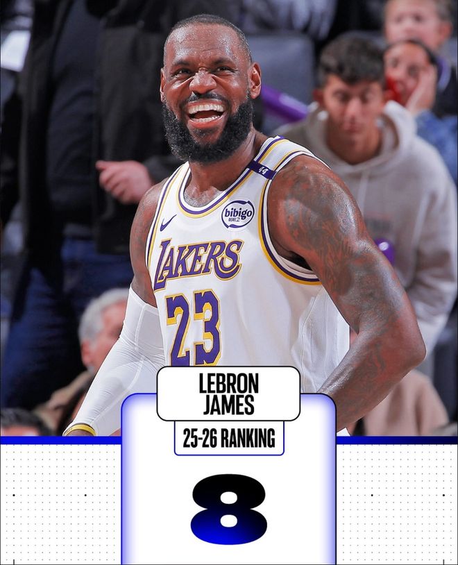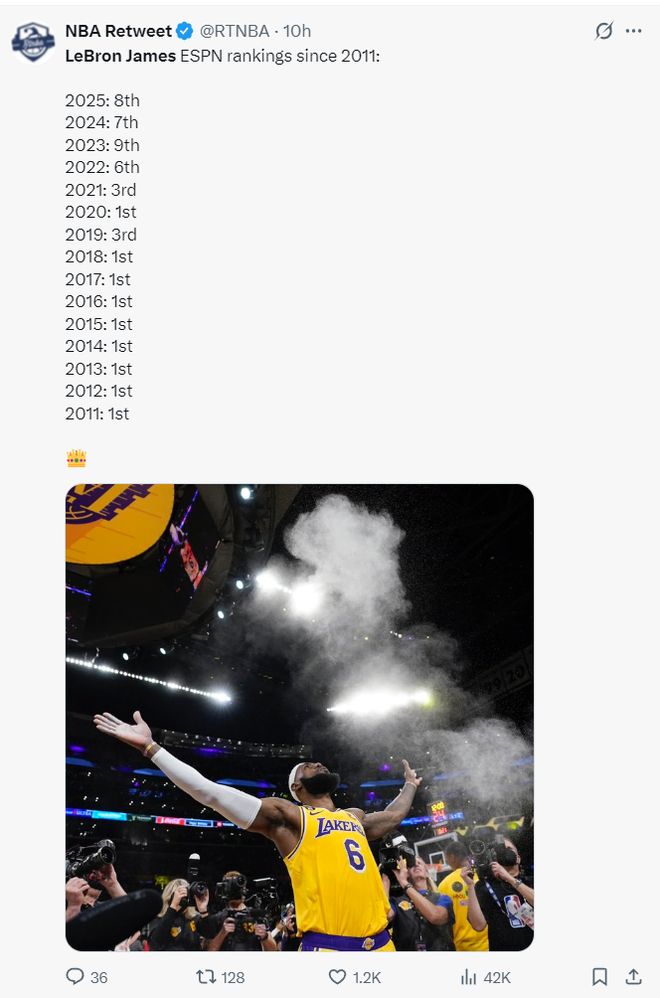 美媒更是曬出2011年-2025年勒布朗-詹姆斯在ESPN中的排名,2011-2018都是第一,2019是第三,2020年重返第一,隨后2021-2025分別是:3、6、9、7、8,一直都沒有跌出過(guò)聯(lián)盟前十。