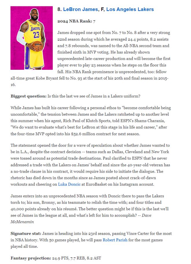 ESPN寫道:40歲詹從去年的第七下滑到今年的第八,他22個(gè)賽季依舊出色,場(chǎng)均24.4分8.2助攻7.8籃板入選最佳二陣,MVP投票排名第六。他將成為歷史首位進(jìn)入23個(gè)賽季的球員,要知道15-16賽季最后一個(gè)賽季的科比僅僅排在聯(lián)盟第93位。最大的問(wèn)題是:這是我們最后一次看到勒布朗穿湖人球衣嗎?