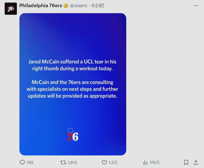 北京時間9月26日,76人官方宣布:賈里德-麥凱恩今日訓練時遭遇右手拇指前交叉韌帶(UCL)撕裂。麥凱恩正在跟醫療專家探討治療方案,目前還不知道要缺陣多久。魔仙哥一年之內兩次受傷,上賽季他遭遇左膝外側半月板撕裂。