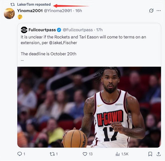 在BR記者杰克-費舍爾報道火箭隊與塔里-伊森的提前續(xù)約談判也陷入僵局后,湖人媒體Laker Tom點贊,湖人大VYinoma2001還轉(zhuǎn)推發(fā)了一個思考的表情包。