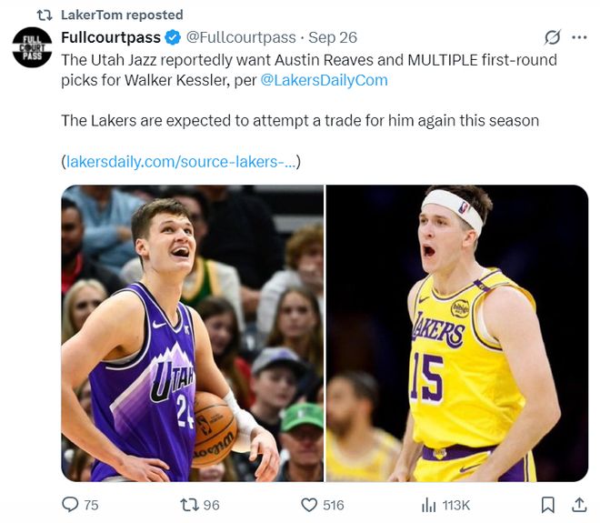 兩天之前,根據(jù)湖人國度的報道,湖人與爵士可能重啟關(guān)于凱斯勒的交易談判,因為今夏爵士與凱斯勒的提前續(xù)約陷入僵局,如果湖人同意用里夫斯+3個首輪簽換凱斯勒那么交易可能會達成。