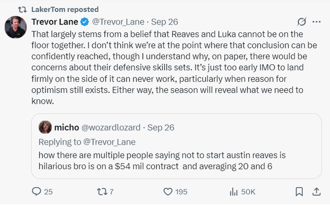 隨后有湖人球迷表達不滿,但湖人記者Trevor Lane回應(yīng):主要原因是球迷們都認為里夫斯、東契奇不該同時留在場上,這兩人同時在場讓其余球員的防守壓力過大,長此以往絕對不是好的選擇,當然這種說法可能為時尚早。