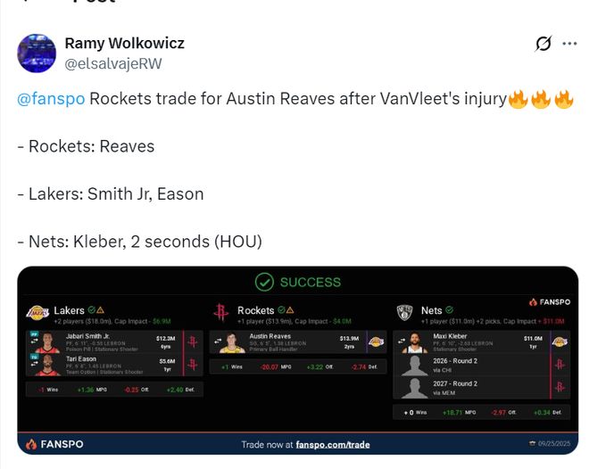 湖媒認為火箭隊正缺少一個組織者,里夫斯可以扮演這樣的角色,而且里夫斯還是一個進攻能力很強的后衛(wèi),他在火箭的防守體系下可以很好的被保護起來。而湖人隊則得到一個頂級的3D側(cè)翼與一個先發(fā)水準的空間型四號位,勒布朗的壓力會大幅降低。(我個人覺得這種交易建議純粹是打劫休斯頓火箭隊)