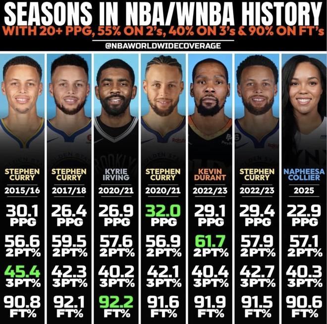 這是一份“又能得分、又極高效”的稀缺清單:場均 20 分以上,同時兩分、三分、罰球分別達到 55%、40%、90%。名單里有庫里的三度達成,也有歐文、杜蘭特與科利爾的代表賽季。