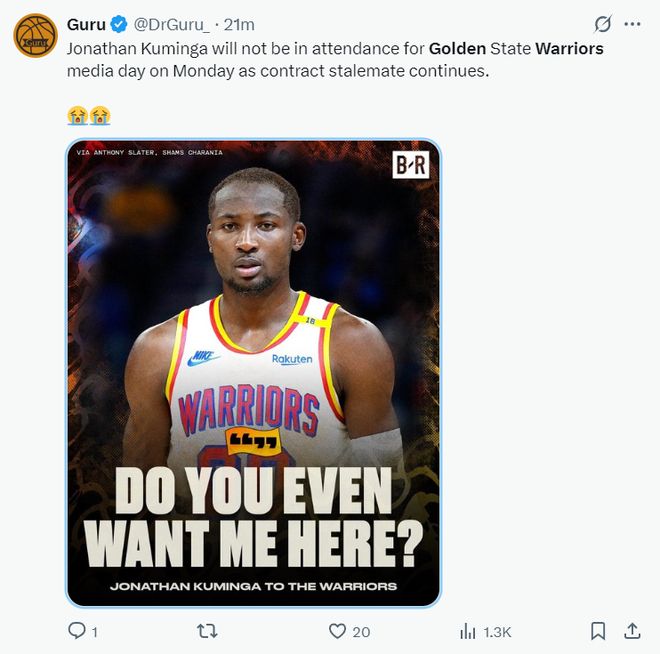 但是根據Shams的報道,喬納森-庫明加因為跟勇士隊的續約沒有談攏,他將不會出席勇士隊的媒體日,勇士隊會在美國時間周三決定最終給庫明加什么額度的合同。