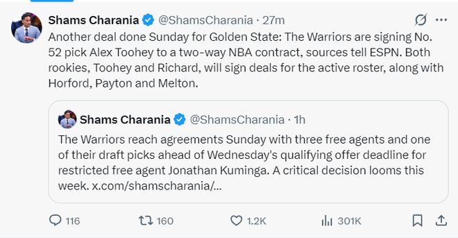 在勇士簽下威爾-理查德(56號秀)后,他們又跟52號秀亞歷克斯-圖希簽下了雙向合同,換言之勇士隊已經連續簽下五人:霍福德、小佩頓、梅爾頓、理查德、圖希。勇士跟理查德簽下的是四年新秀合同,前兩年全額保障。