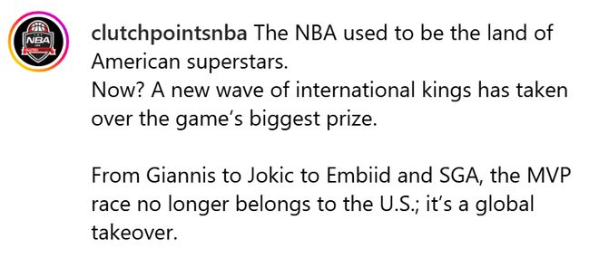 這是NBA權力格局的真正轉變 —— 籃球界的頂尖天才,不再僅來自某一個國家,而是源自全球各地。上一次美國球員斬獲常規賽MVP獎項,已經要追溯到2018年的詹姆斯-哈登,此后7年,這一獎項都被國際球員把持。下一次美國球員當選常規賽MVP,要到什么時候呢?歡迎大家發表見解。