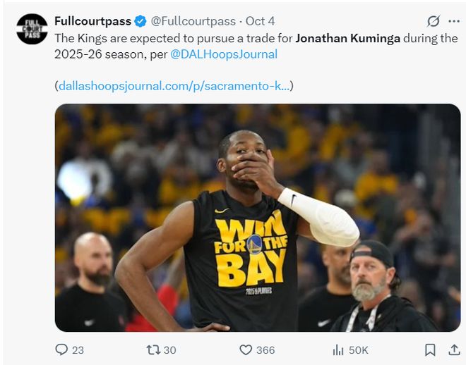 根據BR記者杰克-費舍爾的報道,國王在25-26賽季還有想要交易得到庫明加,除了國王外太陽、公牛也有意庫明加。如果勇士為了提高庫明加的身價,說不定會讓他在新賽季更多打先發,畢竟先發登場時間至少在30分鐘左右,庫明加能拿到更好的數據。