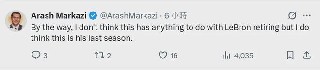 此外,湖人跟隊記者Arash Markazi表示,他始終認為這次預告與退役無關,“但我確實覺得這會是詹姆斯的最后一個賽季”。