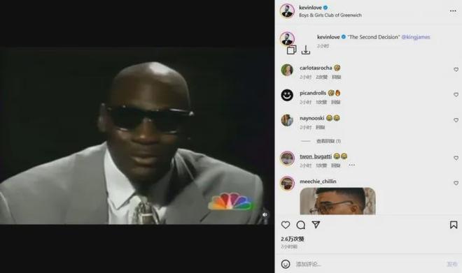 作為詹姆斯的多年好友和前隊友,每次碰面都要大力擁抱詹姆斯的樂福則拿出一張喬丹于2003年在奇才舉行退役儀式的視頻,開玩笑寫了“決定二”。